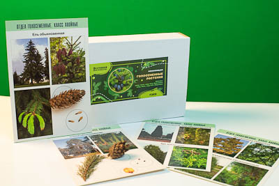 В коллекции представлены побеги, шишки и семена хвойных растений. Натуральные образцы сопровождаются фотографиями взрослых растений. Планшеты формата А4 изготовлены из картона и ламинированы глянцевой пленкой.