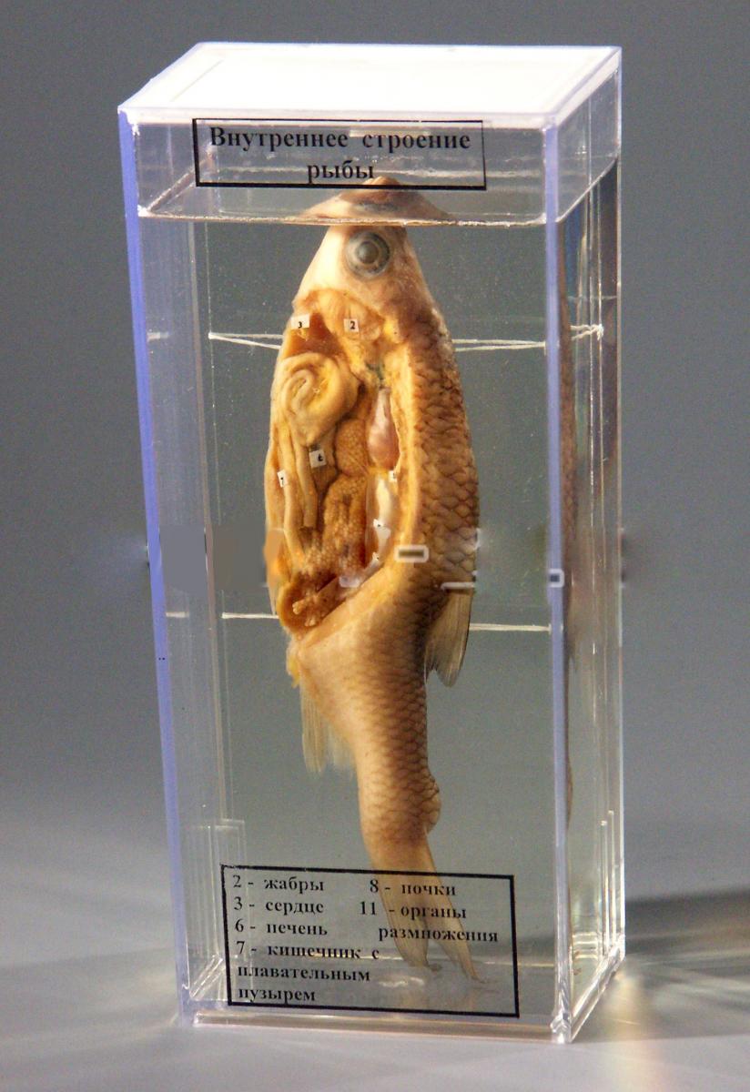 Препарат закреплен на стеклянной пластине, которая помещена в консервирующую жидкость и установлена в пазы прозрачного пластмассового сосуда и пластмассовой крышки. Сосуд герметично закрыт. На препарате представлена пресноводная рыба, вскрытая с брюшной стороны и с одной снятой жаберной крышкой. На препарате можно рассмотреть: 1. Жабры; 2. Сердце; 3. Печень; 4. Кишечник с плавательным пузырем; 5. Почки; 6. Органы размножения.