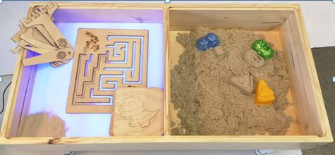 Стол имеет 2 отсека - световой для рисования песком и песочницу для игр с кинетическим песком или проведения песочной терапии.
