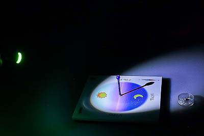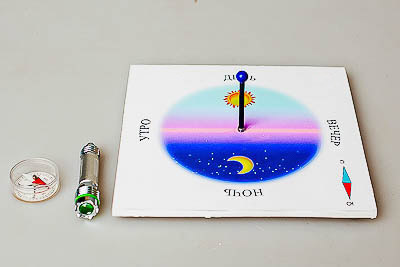 Пособие представляет собой модель солнечных часов для Северного полушария, изготовленную на пластиковой основе, с расположенным в центре гномоном. Для моделирования Солнца используется фонарик.