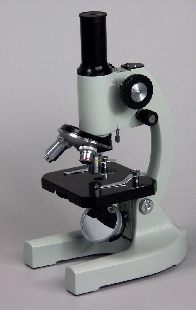 - Штатив микроскопа с предметным столиком (с клеммами и диском с диафрагмами), трехгнездным револьвером. Основание с источником света – зеркалом.