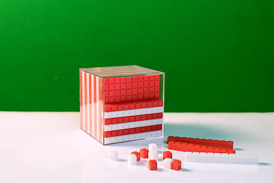 Модель представляет собой прозрачный пластмассовый куб со стороной 10 см, в котором уложено 9 пластин 10×10×1 см. Верхний слой состоит из 9 полосок 10×1×1 см и 10 элементов 1×1×1 см. Для лучшего восприятия элементы (пластины, полоски и кубики) красного и белого цветов чередуются.