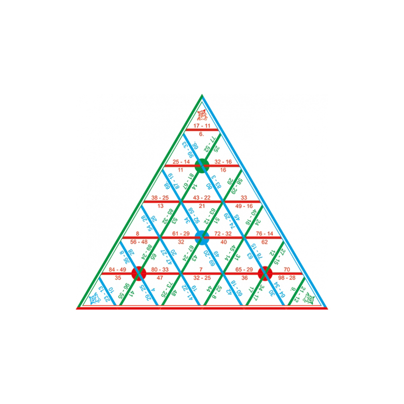В комплект входят равносторонние треугольники с заданиями и ответами на сторонах треугольника (49 шт.). Если правильно совместить задания и ответы, то образуется пирамида.