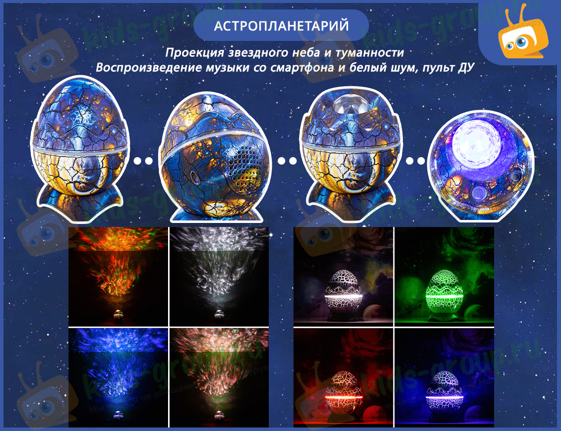 Астропланетарий подарит много ярких впечатлений и детям, и взрослым. Он выполнен в виде яйца динозавра, украшенного ярким космическим рисунком. Еще интереснее богатый функционал прибора: светодиодная и лазерная проекции, воспроизведение музыки с телефона, белый шум. Основные особенности:
