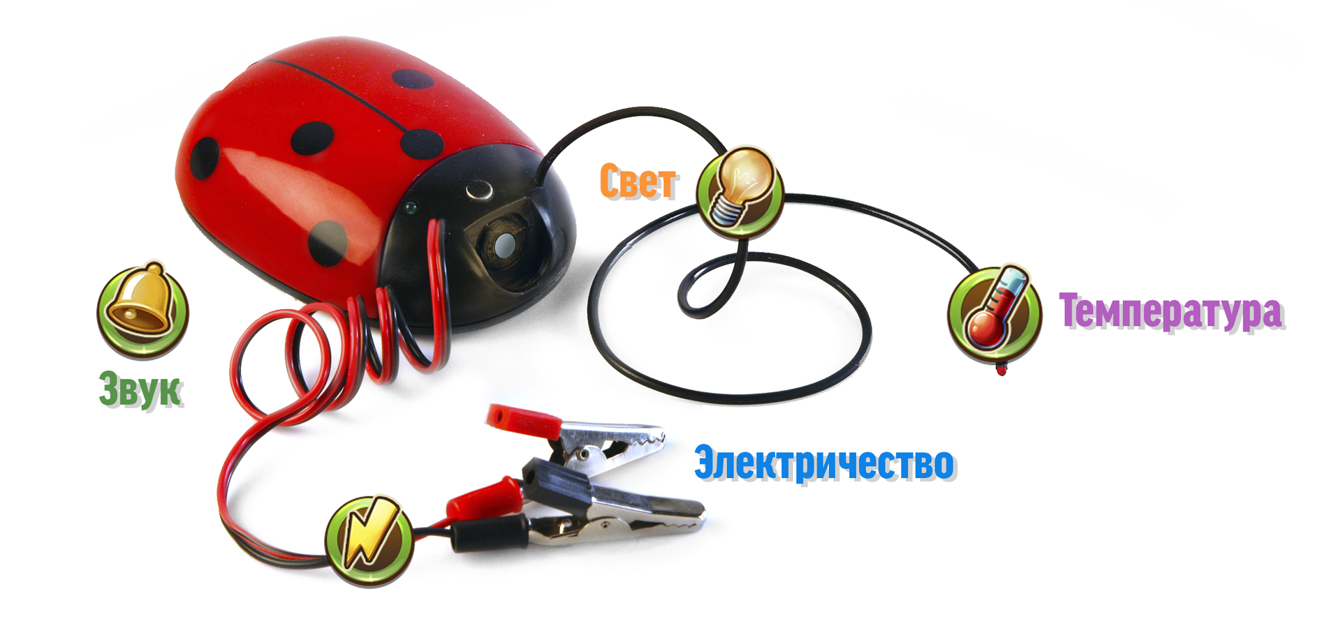 В ходе занятия с набором «Мультимедийная лаборатория» дети проводят эксперименты с использованием датчика в виде «Божьей коровки», а мультимедийный интерактивный герой ставит ребенку задачи и комментирует результаты экспериментов.