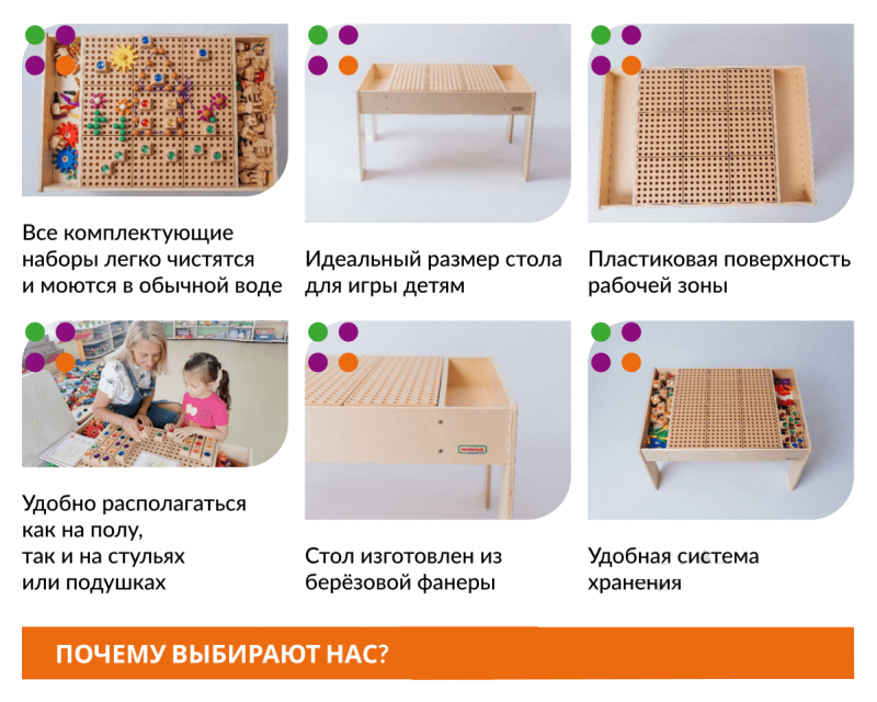 С помощью данных СТЕМ – столов можно заниматься изучением основ математики, решать творческие задачи, а также, в процессе работы, развивать сенсорные навыки и мелкую моторику пальчиков.