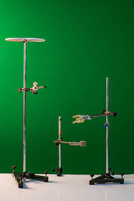 Подставки прикрепляются к крышке демонстрационного стола с помощью струбцины. Три стойки позволяют собирать установки, для которых необходимо наличие двух штативов, а в тех случаях, когда собранную установку необходимо укрепить на высоте более 750 мм, общая высота штатива увеличивается с помощью резьбового соединения двух стоек.