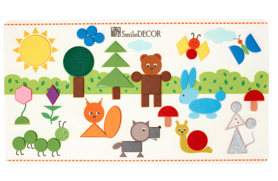 1. Рассмотрите сказочную поляну вместе с ребенком. Предложите «раскрасить» поляну, подбирая соответствующие фигурки по цвету и форме. Назовите, какого цвета, какой формы хвостик у зайца, лапы у мишки, нос у волка и т.д. Сортируйте геометрические фигуры по цвету, форме, размеру.