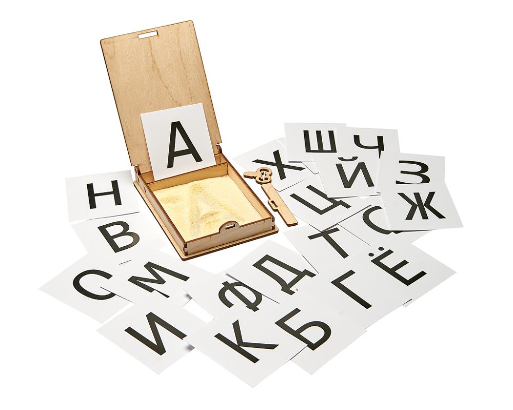 Насыпьте в коробочку тонким слоем крупу (манную, гречневую, кукурузную или пшенную). Вставьте карточку с буквой в планшет и начинайте рисовать. Рисовать можно пальцем и деревянным ключиком, который закрывает коробку. Чтобы выровнить крупу (для рисования новой буквы) - используйте специальную палку-помогалку, вложенную в набор.