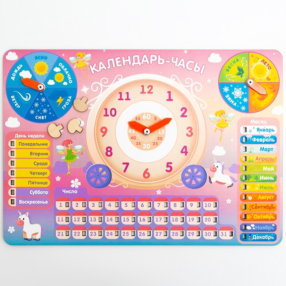 Игра Календарь – часы для девочек состоит из деревянной панели прямоугольной формы и пластиковых стрелок на металлической оси. На панели изображены: циферблат с часами и минутами и два круга с секторами, категории время года и явления природы. Также на деревянной панели есть поле для обозначения дней недели, месяцев и чисел. Каждое поле имеет необходимое количество отверстий и деревянные детали в форме деревца, которые нужны для каждой категории: Дни недели, Числа, Месяцы. Игра красочна и включает в себя авторские художественные рисунки.