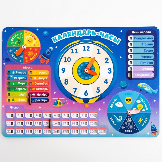 Игра Календарь – часы для девочек состоит из деревянной панели прямоугольной формы и пластиковых стрелок на металлической оси. На панели изображены: циферблат с часами и минутами и два круга с секторами, категории время года и явления природы. Также на деревянной панели есть поле для обозначения дней недели, месяцев и чисел. Каждое поле имеет необходимое количество отверстий и деревянные детали в форме деревца, которые нужны для каждой категории: Дни недели, Числа, Месяцы. Игра красочна и включает в себя авторские художественные рисунки.