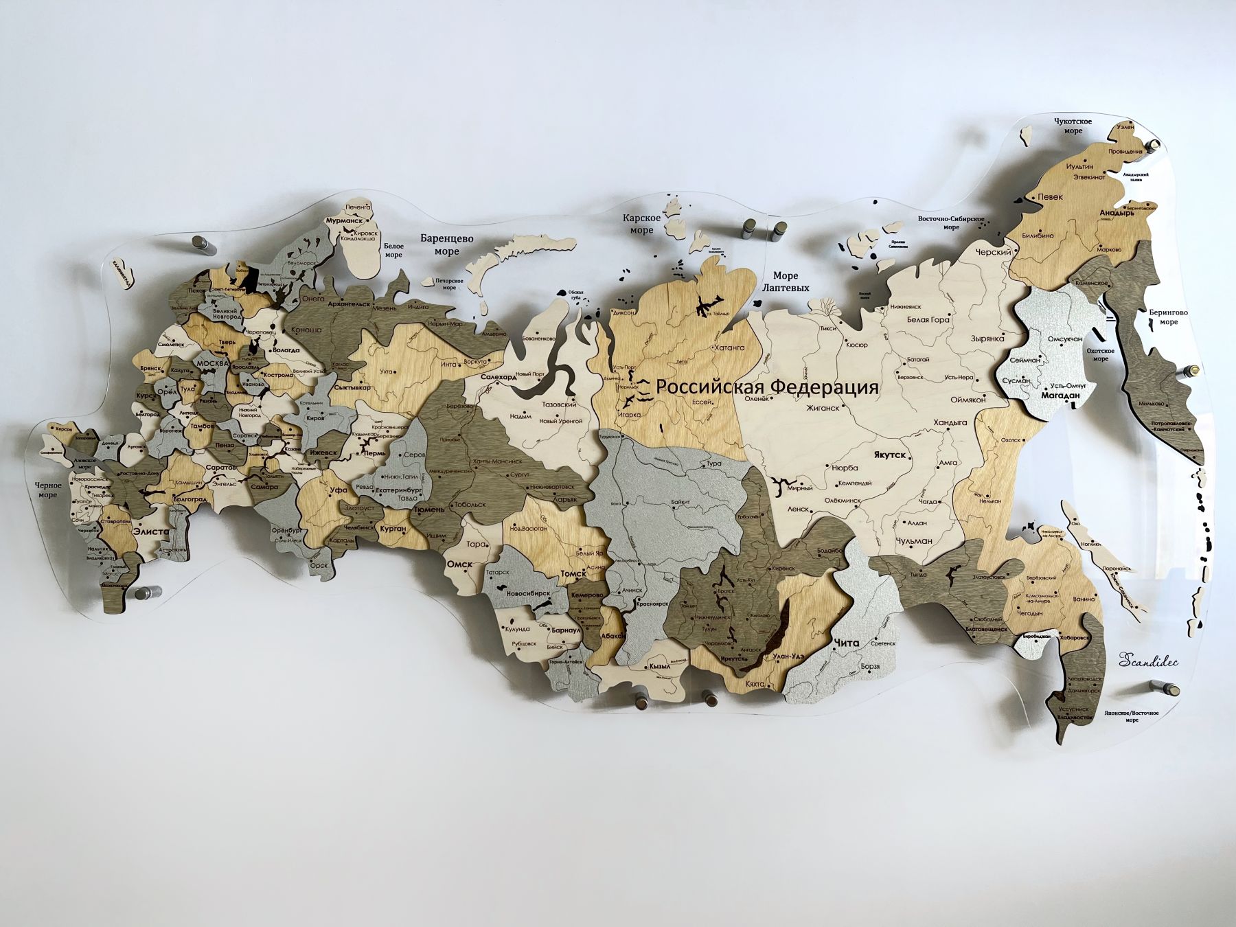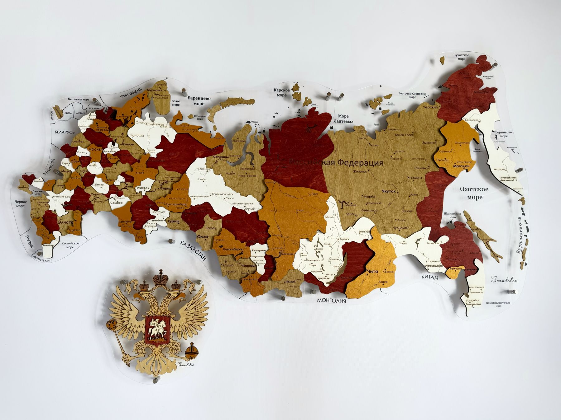 Карта России ИЗ ДЕРЕВА многоуровневая, на подложке из орг.стекла 100х55 С ПОДСВЕТКОЙ