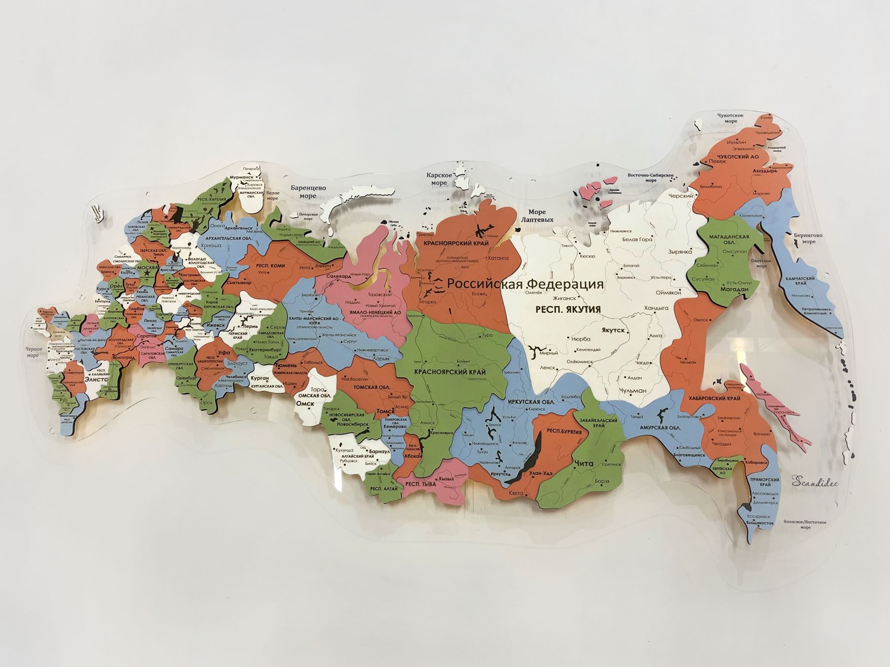 Многоуровневая карта России из дерева, с покраской по федеральным округам, в различных оттенках. Эти расцветки может стать идеальным решением декора для детской комнаты, либо для детского сада.