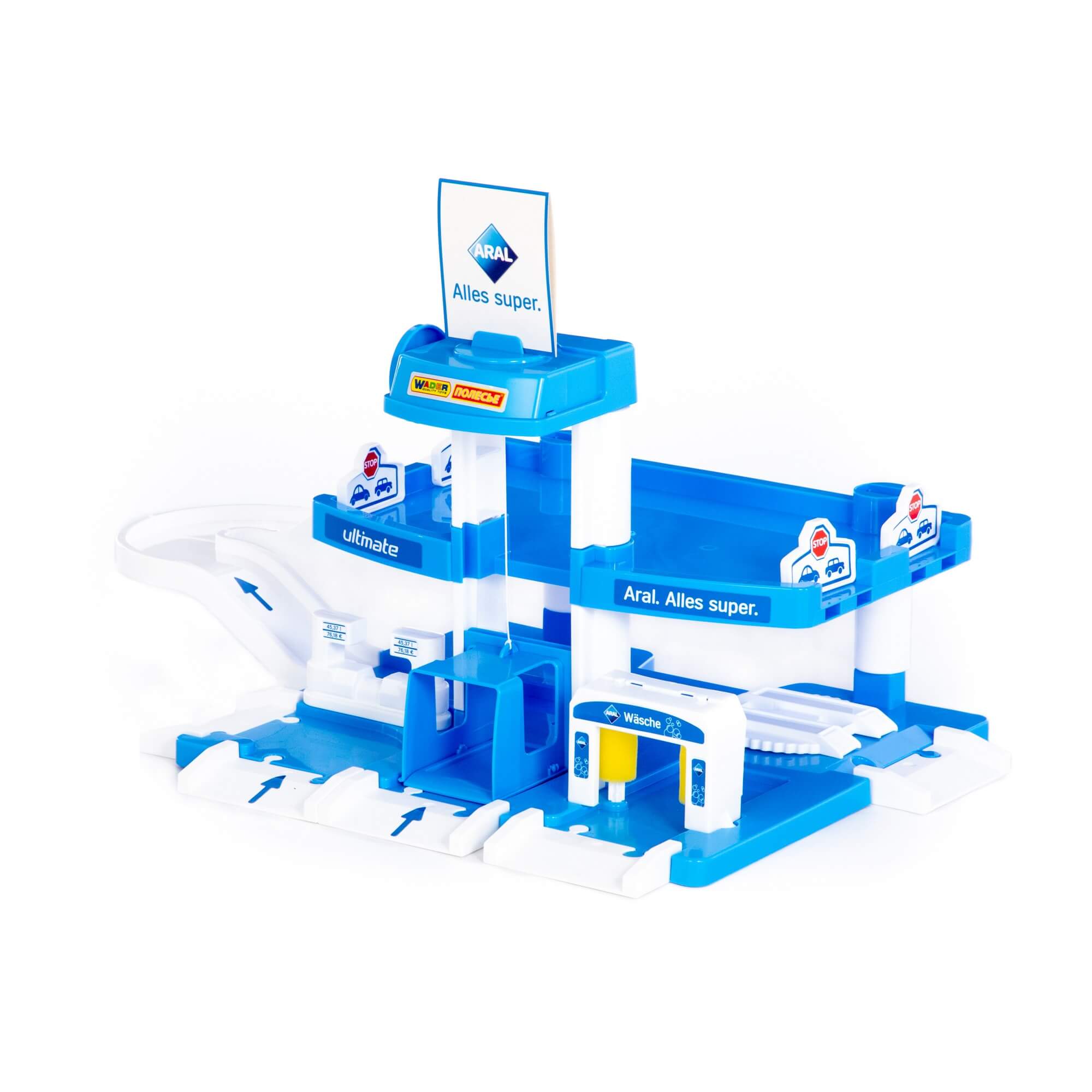 На первом уровне паркинга расположены автомойка, автозаправка, эстакада. Для подъема на второй уровень установлен лифт, который приводится в движение с помощью рукоятки на верхнем уровне. Автомобили в набор не входят.