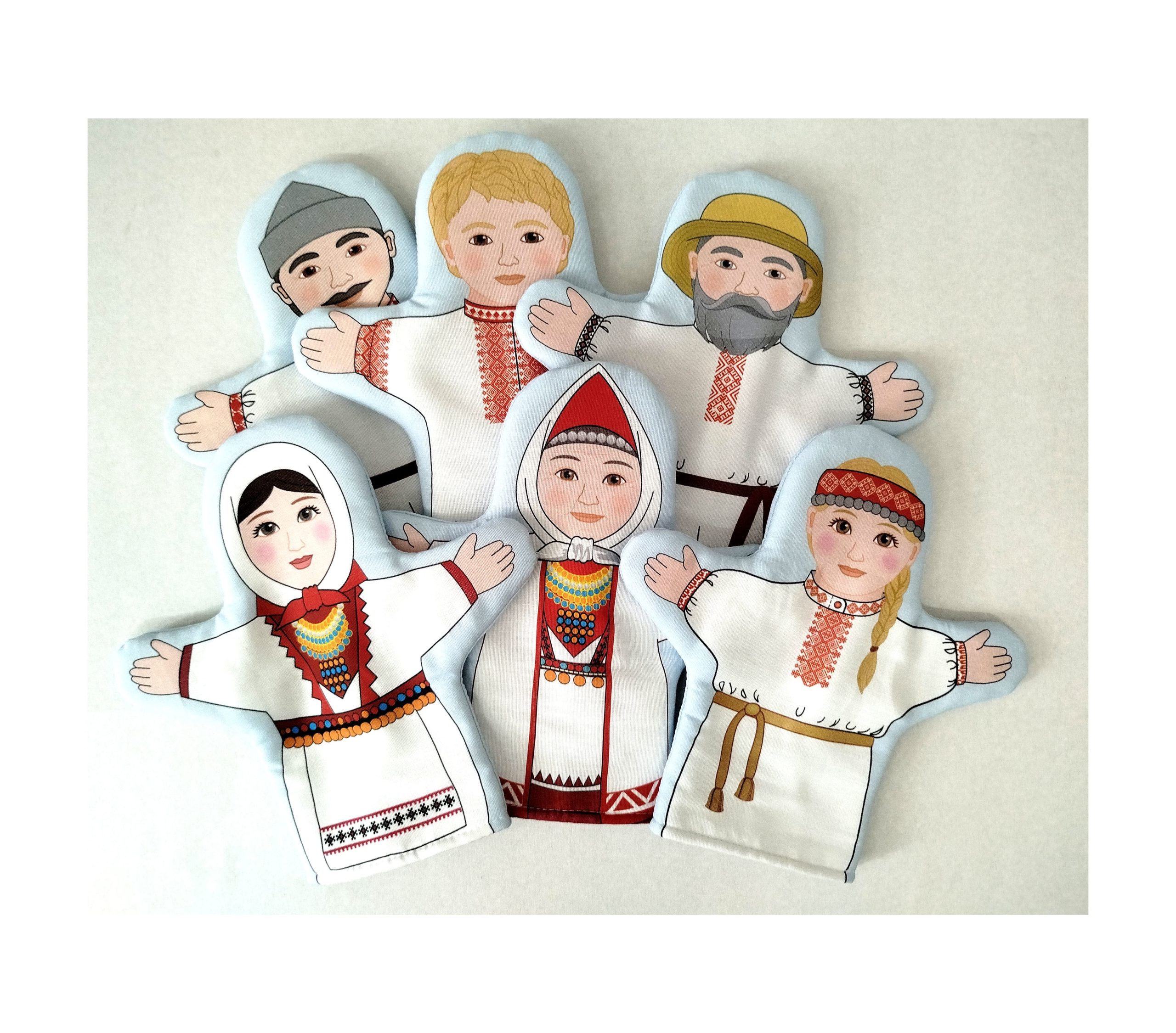 Набор наручных кукол представляет собой рукавички с изображенными членами марийской семьи в национальных костюмах: дедушка, бабушка, папа, мама, мальчик, девочка.