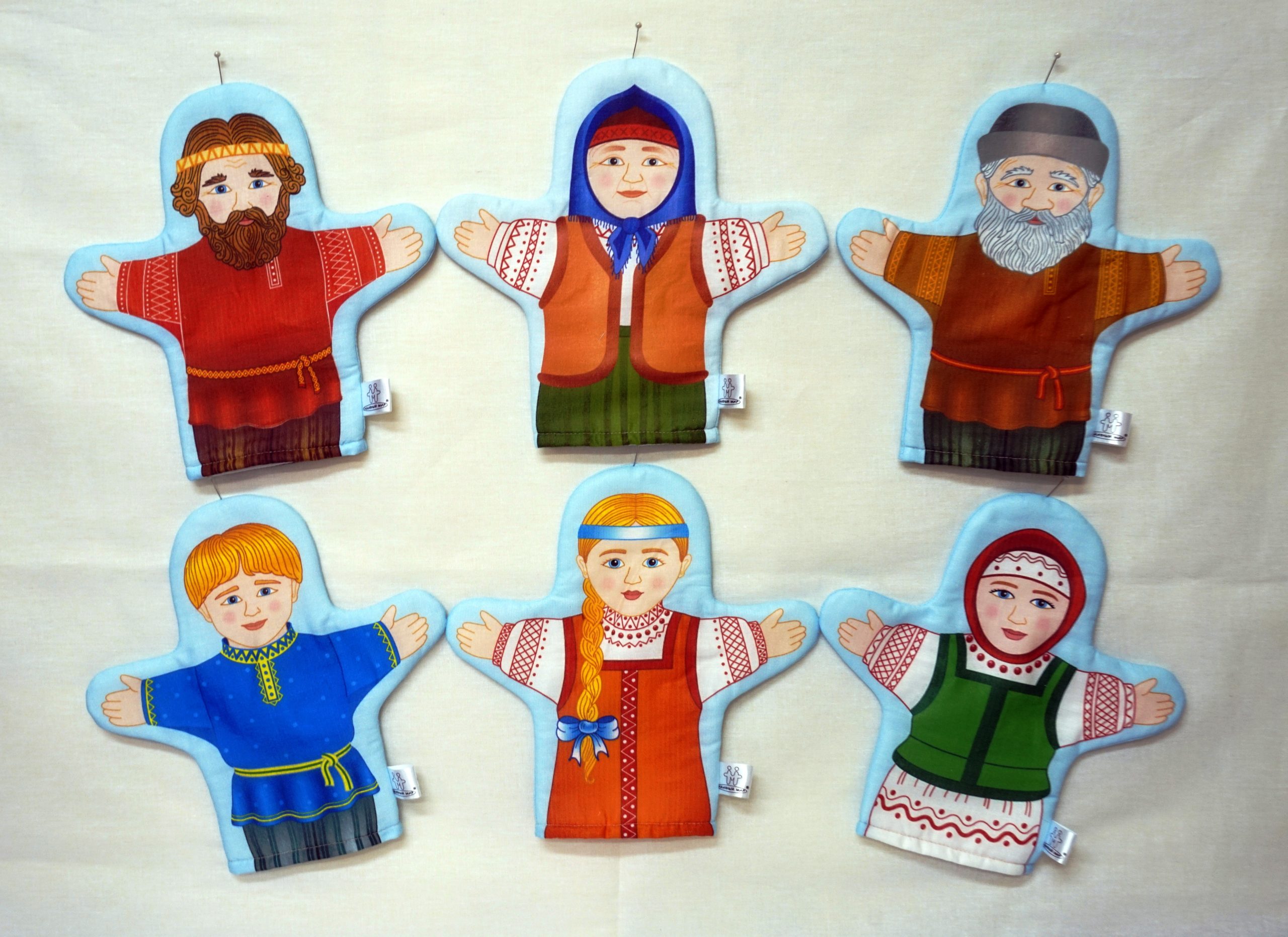 Набор наручных кукол представляет собой рукавички с изображенными членами русской семьи в национальных костюмах: дедушка, бабушка, папа, мама, мальчик, девочка.