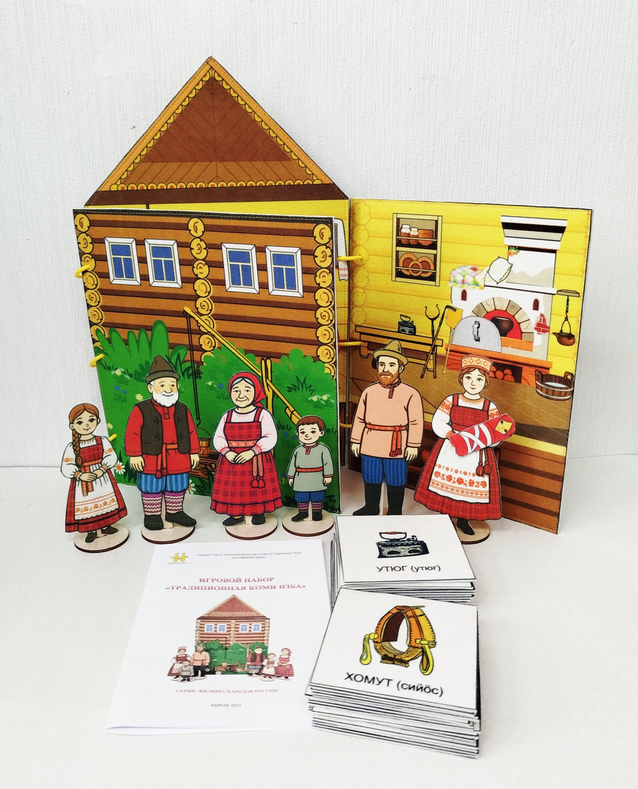 Вместе с папкой вы получите 6 фигурок людей (семья в национальных костюмах) и 35 карточек, изображающих предметы быта. Данный набор может использоваться как демонстрационный материал на занятиях по народной культуре.