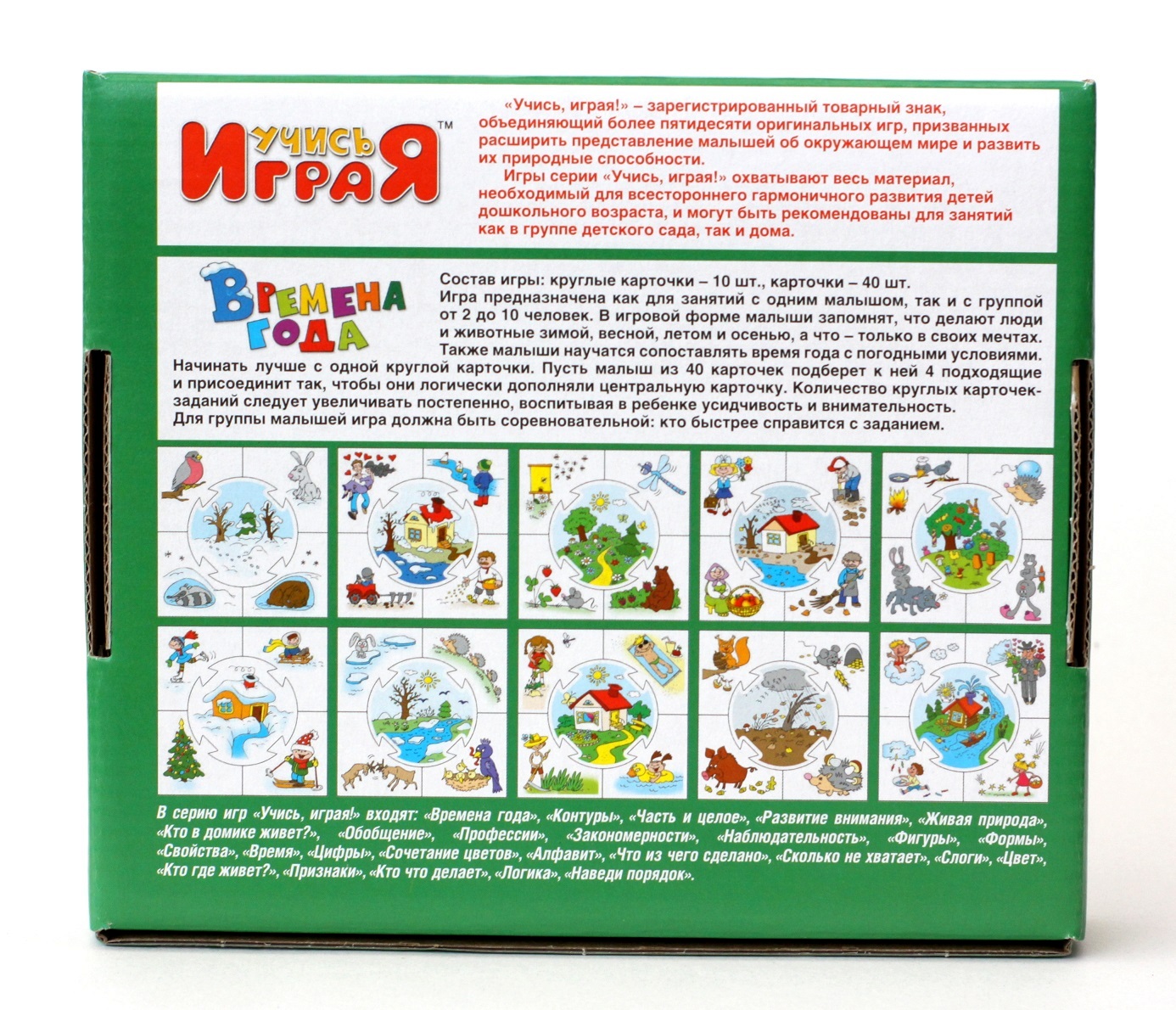 Настольная игра «Времена года» (серия «Учись, играя!»). Состав: круглые карточки – 10 шт., карточки – 40 шт. Материал: бумага, картон. Для детей от 3 лет. Развивает память, логическое мышление и мелкую моторику пальцев рук.