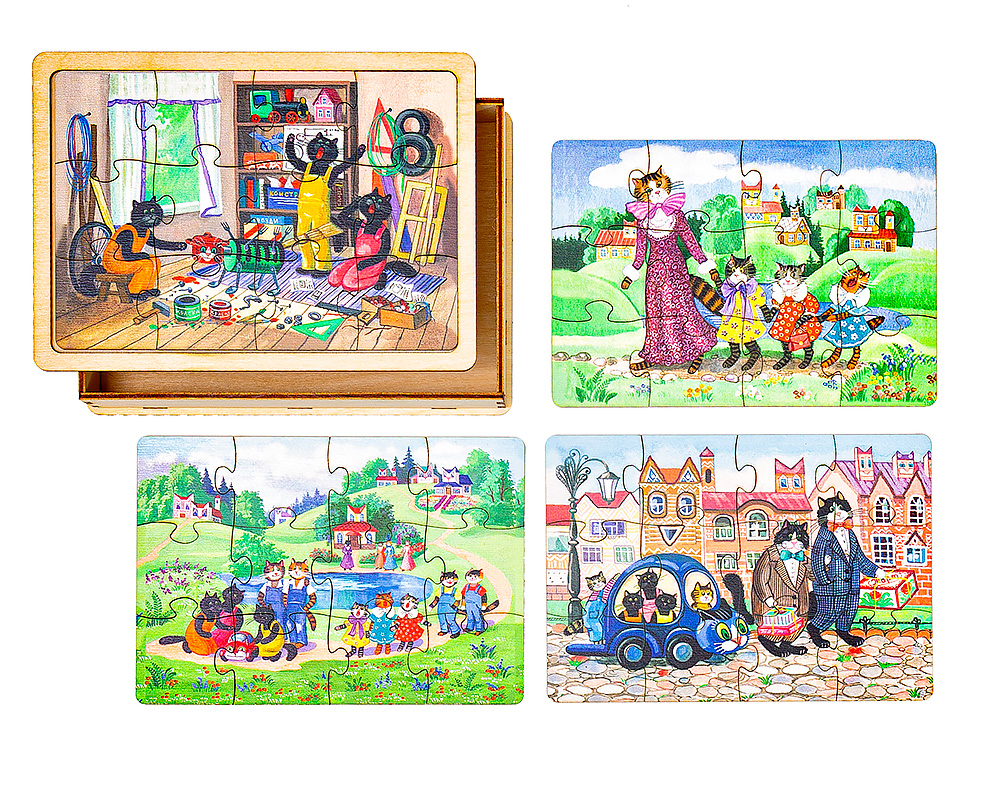 2. Игра «Собиралки». Выберите одну карточку с кошачьей историей и попросите ребенка собрать такую же картинку из элементов пазла в деревянной рамке.