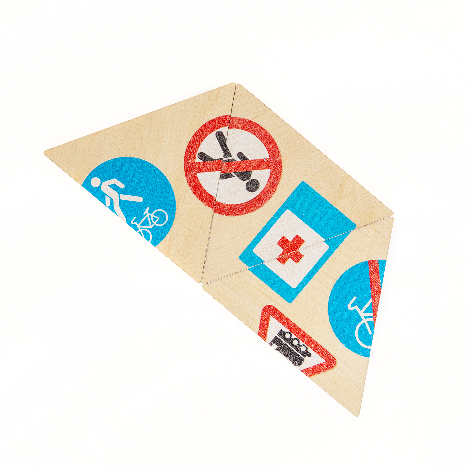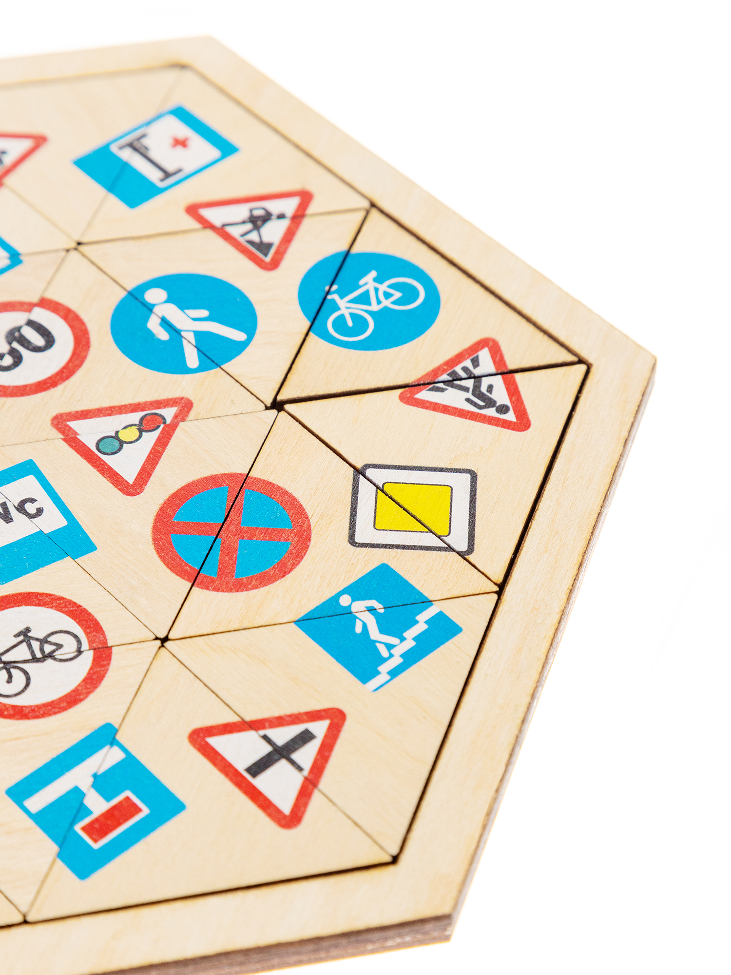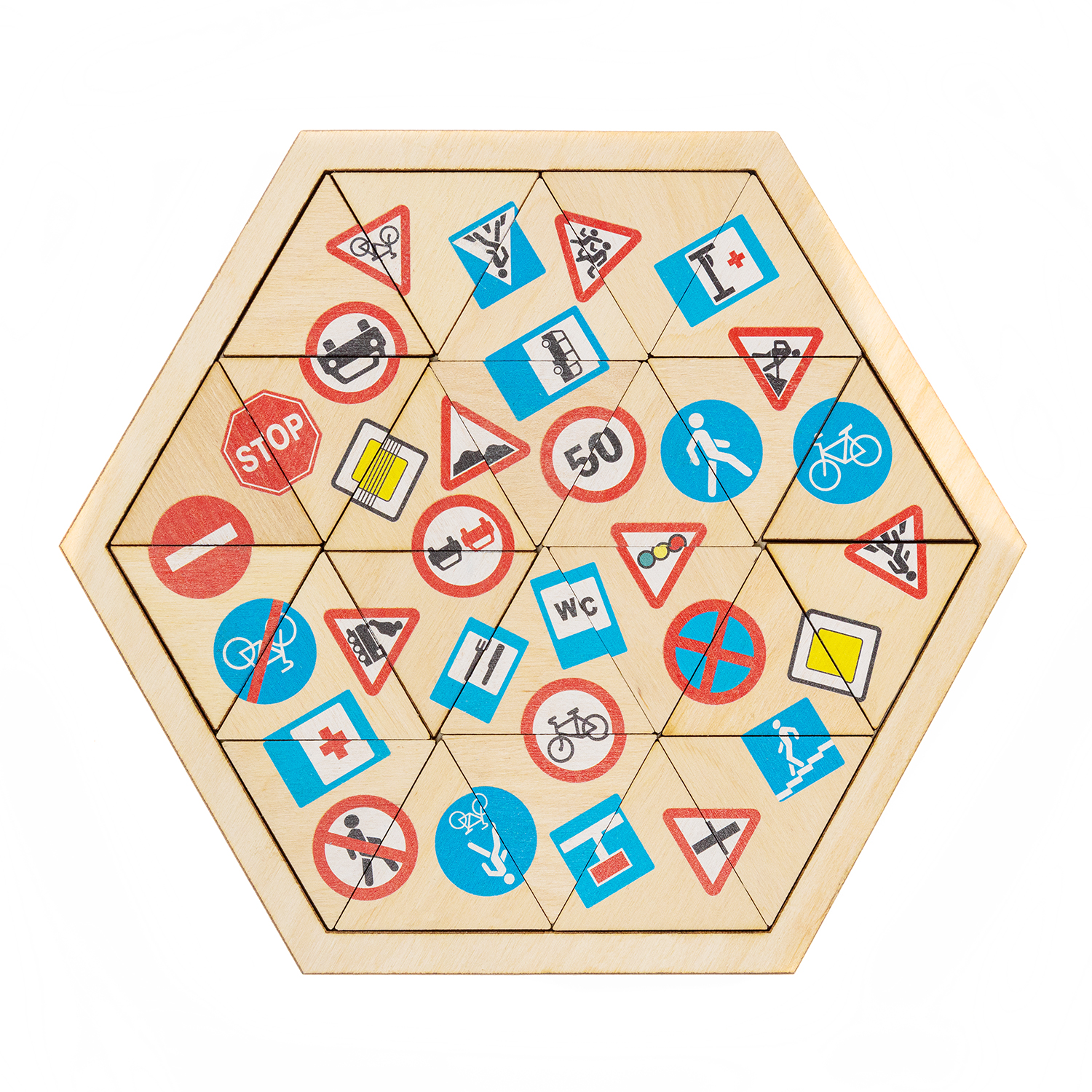 Пазл деревянный «Дорожные знаки». Состав: рамка шестиугольная (размер поля от угла до угла по горизонтали – 22,5 см, высота между параллельными сторонами по вертикали – 19,5 см), детали пазла – 24 шт. (5х5х5 см). Материал: фанера (березовая). Рекомендовано для детей от 3 лет. Развивает логическое мышление, мелкую моторику, щипковый захват, зрительное восприятие, внимательность и усидчивость, знакомит с основными знаками дорожного движения и расширяет словарный запас.