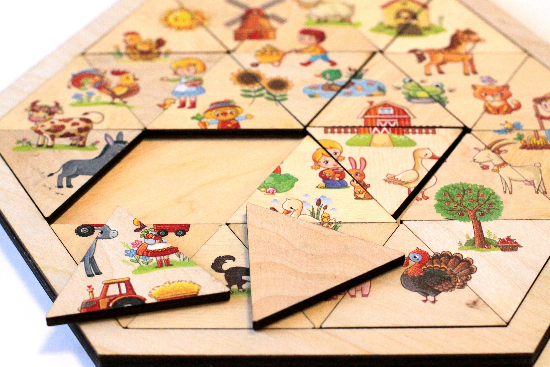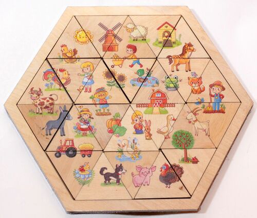 Деревянный пазл в форме шестигранника. Состав игры: деревянное игровое поле в форме шестигранника (размер поля от угла до угла по диагонали – 22,5 см, высота по вертикали между параллельными сторонами – 19,5 см), треугольные фишки – 24 шт. (размер – 5 х 5 х 5 см). Материал: берёзовая фанера. Игровое поле имеет углубление, в котором необходимо расставить фишки так, чтобы собрать 30 картинок, фрагменты которых изображены на пазлах. Картинки посвящены тематике фермерства. Пазл развивает логику, расширяет кругозор.