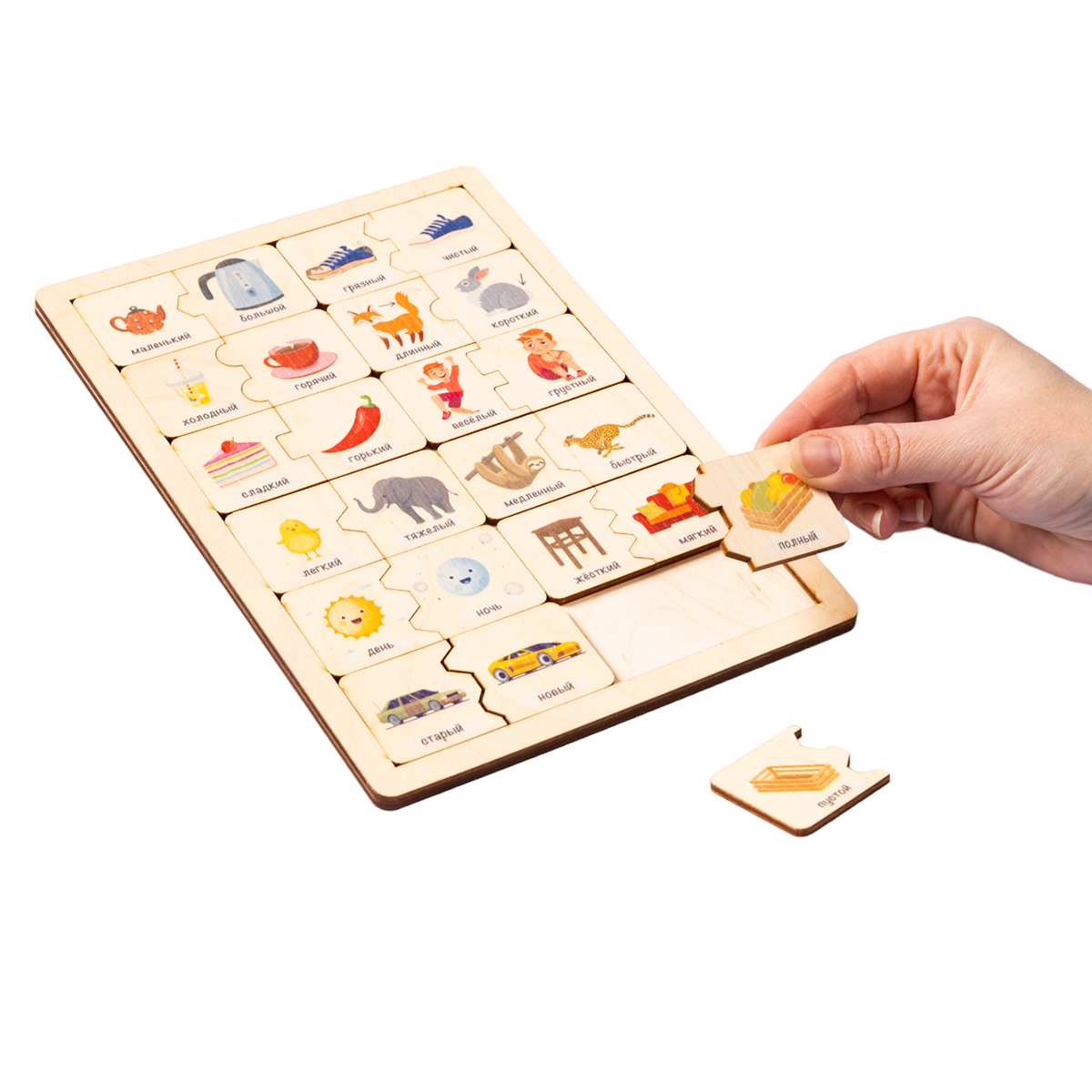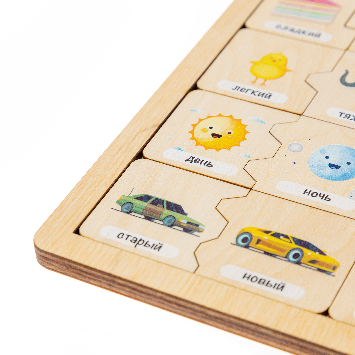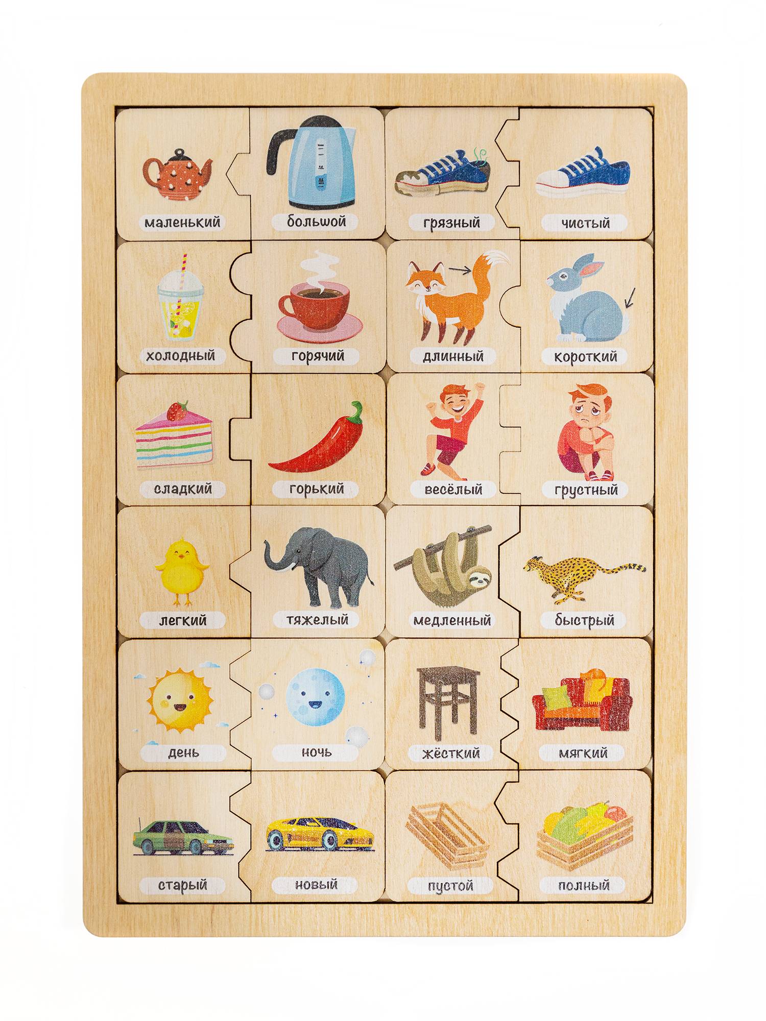 Деревянный пазл «Противоположности» – это развивающая игра, в которой малышу предстоит правильно подобрать пары антиподов.