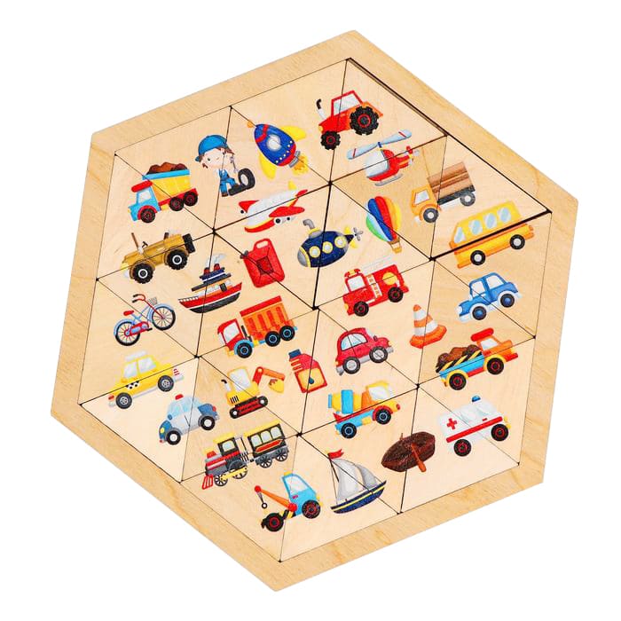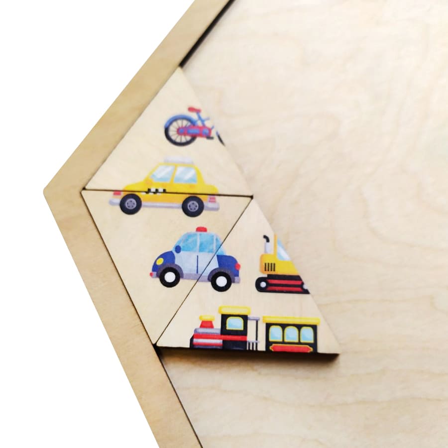 Деревянный пазл в форме шестигранника с треугольными фишками. Состав: игровое поле в форме шестигранника (размер по горизонтали – 22,5 см, размер по вертикали между параллельными сторонами – 19,5 см), треугольные фишки – 24 шт. (размер – 5 х 5 х 5 см). Основа пазла имеет углубление, в котором ребёнку необходимо расставить треугольные фишки так, чтобы все картинки совпали. На каждой фишке – не целая картинка, а только фрагменты 30 рисунков, которые удастся увидеть в том случае, если ребёнок сможет верно сложить все фишки. Картинки посвящены транспортной тематике. Игра расширяет кругозор, а также тренирует логику и мелкую моторику рук.
