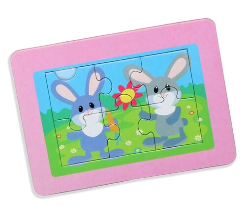 Пазл состоит из 6 крупных элементов (3х4 см) и основы в виде рамки (10,5х14,5 см). На основе напечатан рисунок зайчиков. Изображения наносятся с помощью прямой печати, что обеспечивает износостойкость картинки.