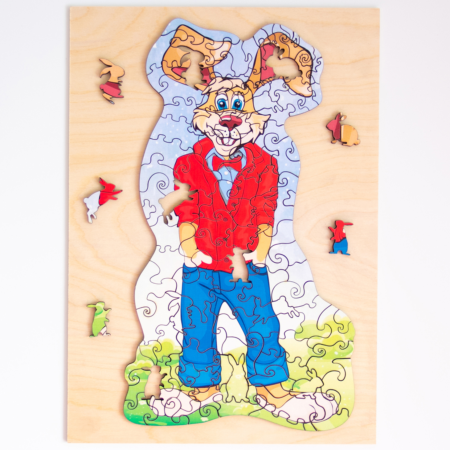 Игрушка предназначена для детей от 3 лет. Пазл Заяц-красавчик изготовлен из дерева – экологически чистого и гипоаллергенного материала. Деревянные пазлы отличаются особой прочностью и долговечностью. Пазл – от английского слова puzzle, означает – головоломка, загадка, мозаика. Это игра, состоящая из различных деталей, при их верном подборе получается единая картина, имеющая законченный смысл. В комплект входит 100 деталей (в деревянной коробочке). Особенность пазла в том, что все детали разной формы, часть из них в виде зайчат.