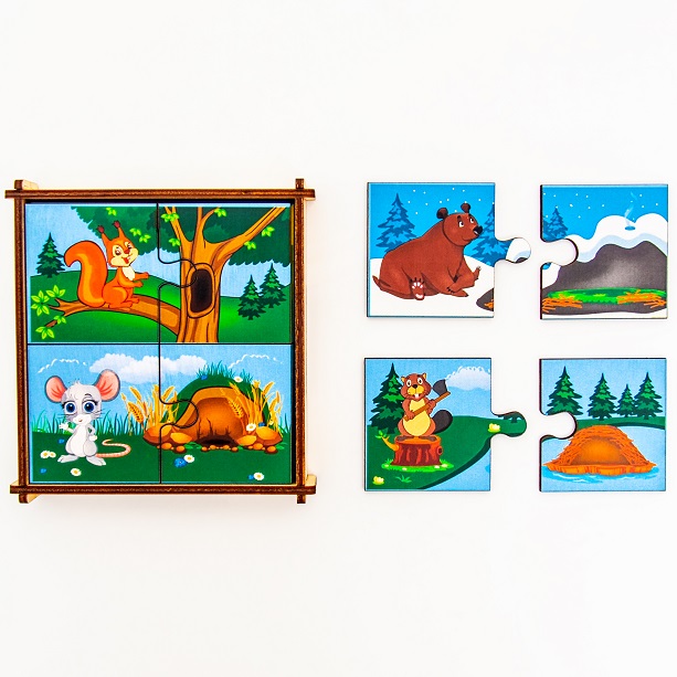 Пазлы – 24 детали, сложенные в деревянную коробочку в 6 рядов по 4-е пазла в каждом. Пазлы имеют законченный смысловой рисунок при соединении и правильном подборе двух деталей. Пара деталей собирается, одна деталь – животное, другая – его дом. В наборе Кто где живёт представлены животные: крот, собака, корова, кошка, лягушка, белка, мышь, медведь, морж, верблюд, бобёр и обезьяна. Деревянную коробочку, в которой лежат пазлы, можно использовать как материал для игры, разбирать и собирать, тренируя мелкую моторику и логику.