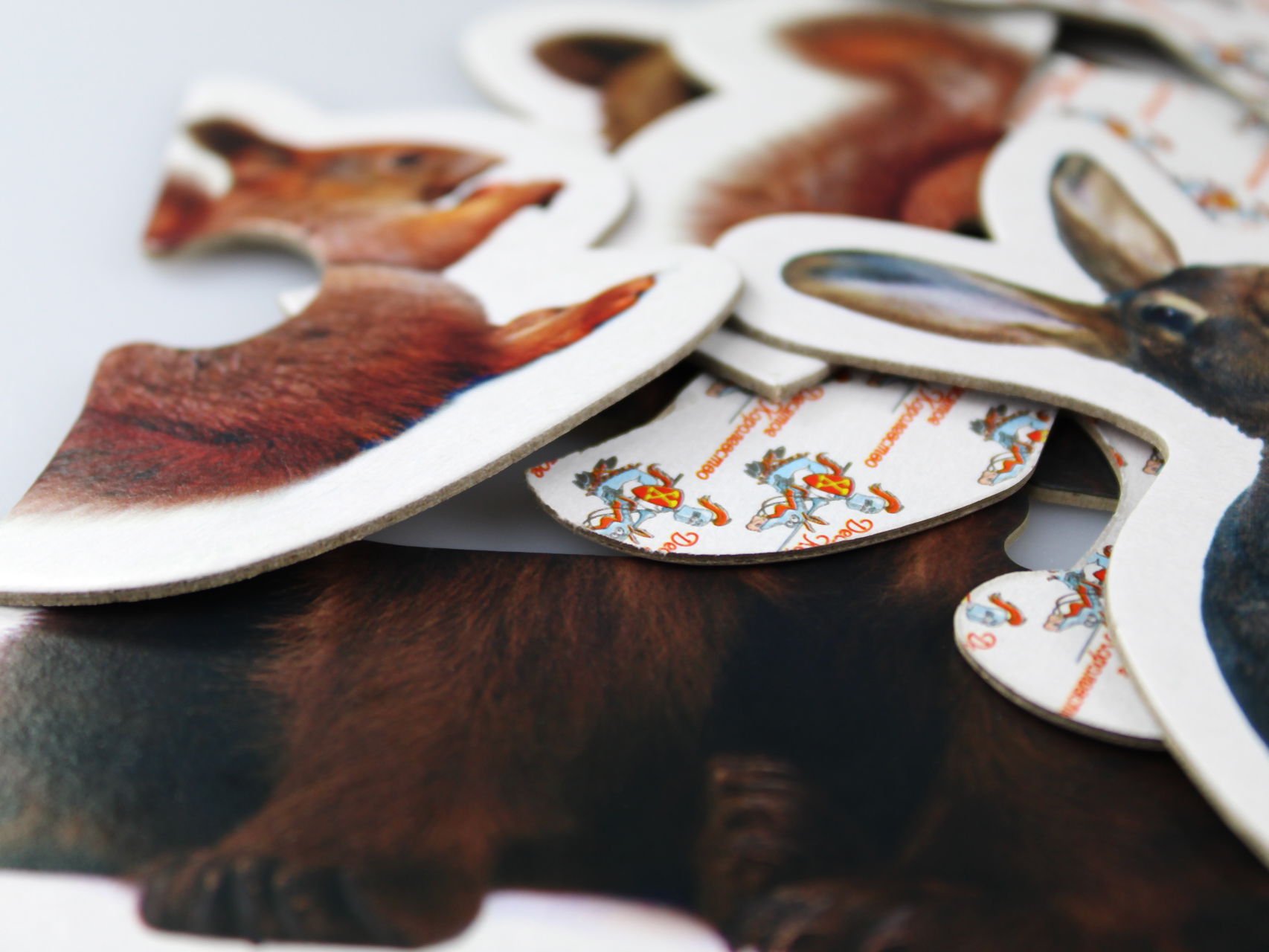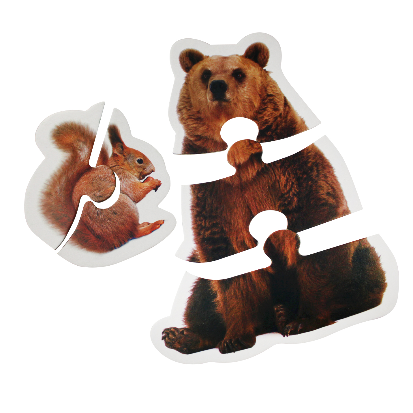Игра предназначена для детей младшего возраста (3+). Крупные элементы удобны для ручки малыша. В коробке 6 контурных пазлов (белка, заяц, лисица, медведь, волк и ёжик). Пять из них состоят из 2 частей, а один из 3. Всего 13 элементов. Размер каждой картинки, состоящей из трех частей примерно 17 см, а состоящей из двух от 7 до 13 см. Пазлы изготовлены из плотного картона, хорошо держат форму. Чтобы они долго радовали Вашего ребенка необходимо соблюдать простое условие - не хранить во влажном помещении.
