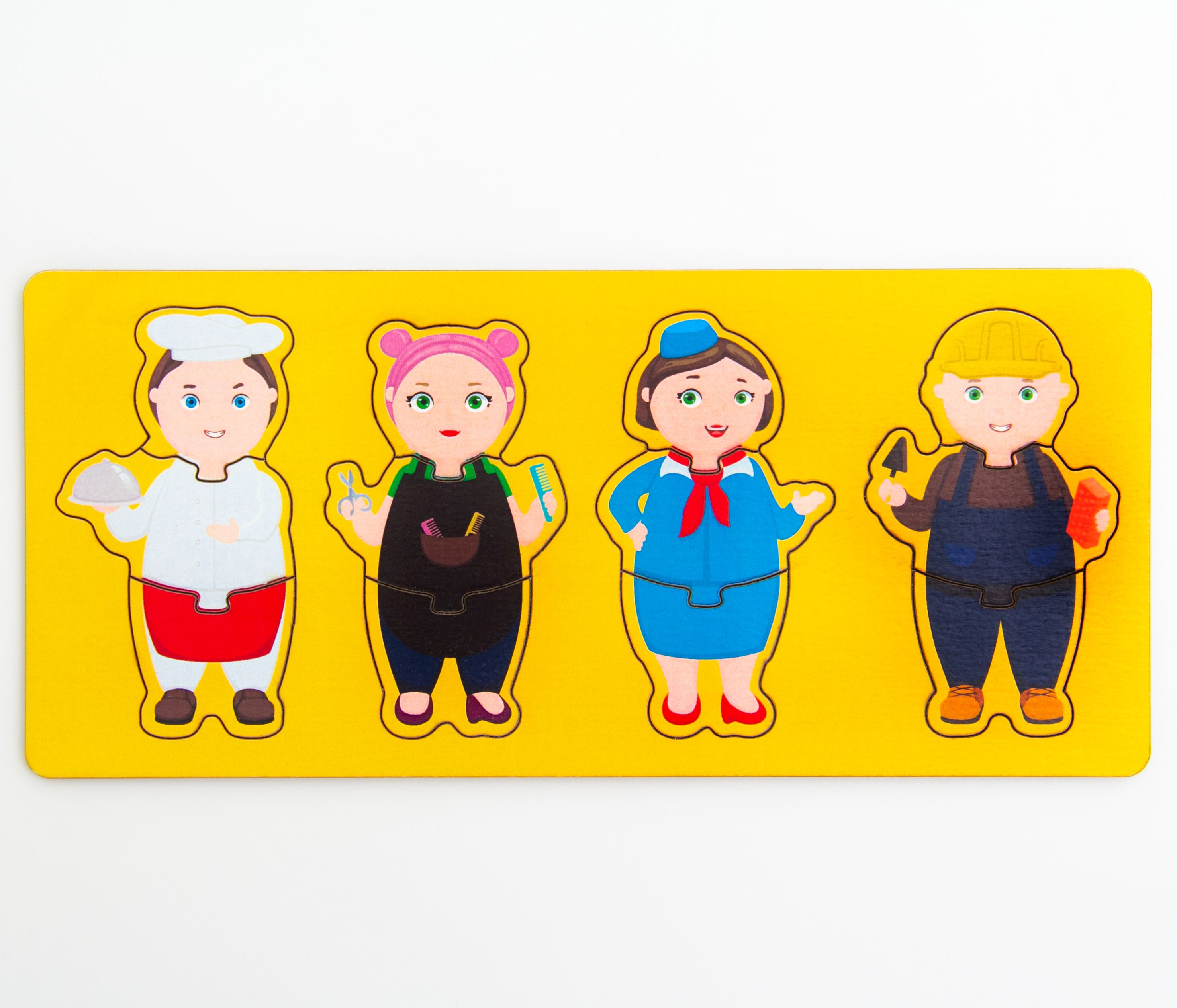 Деревянная плашка – 1 шт. Составные картинки 4 шт. с изображением людей разных профессий (повар, парикмахер, стюардесса, строитель). Каждая картинка поделена на три части.