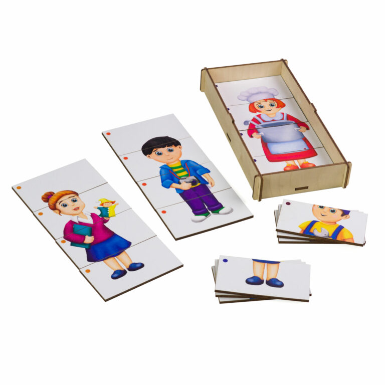 Деревянный ящик для хранения картинок – 1 шт. Составные картинки 6 шт. с изображением людей разных профессий. Каждая картинка поделена на четыре части.