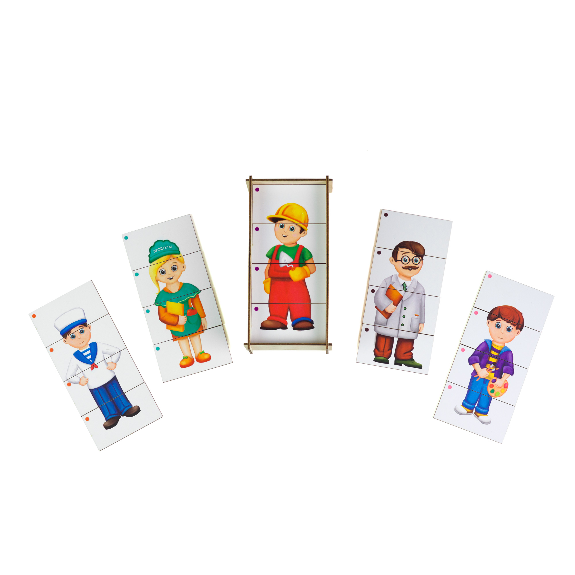 Деревянный ящик для хранения картинок – 1 шт. Составные картинки 18 шт. с изображением людей разных профессий. Каждая картинка поделена на четыре части.