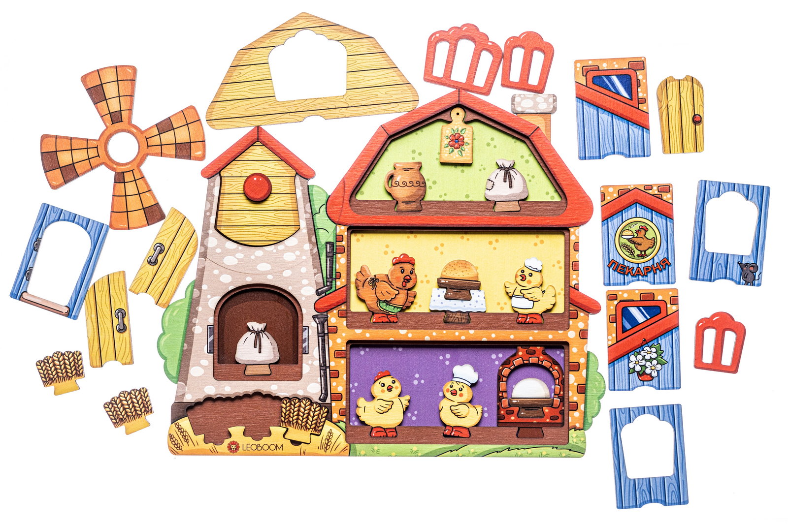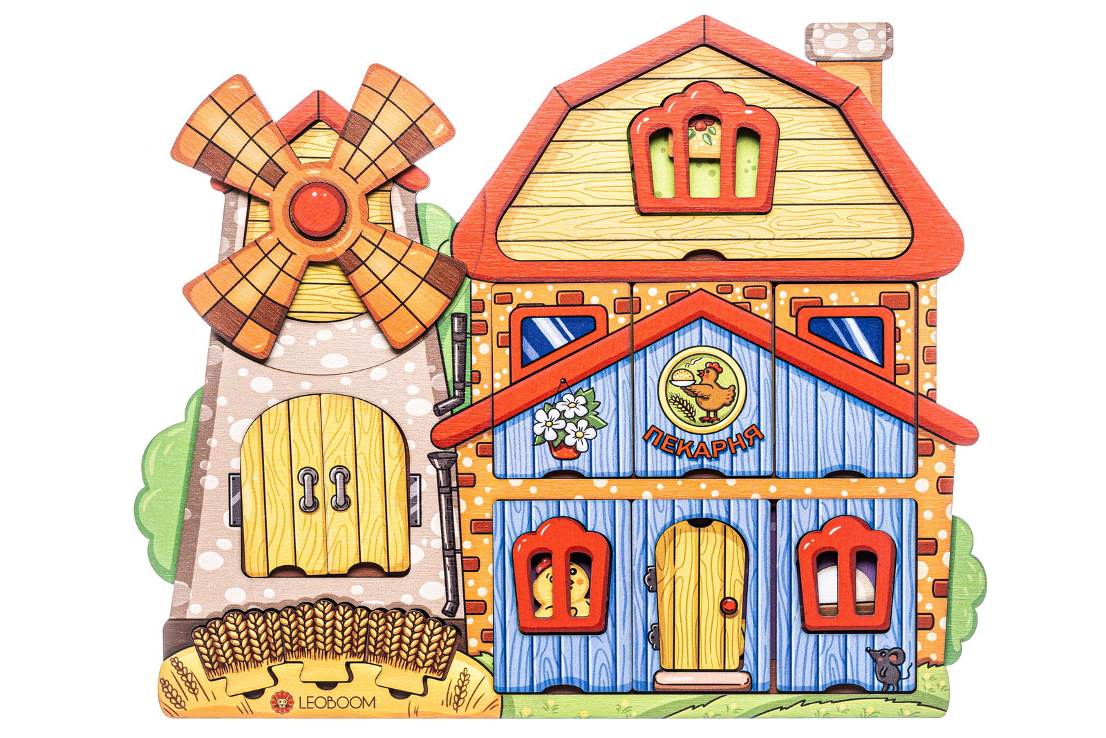2. Игра «Давай построим мельницу!». Предложите ребенку помочь курочке построить мельницу с пекарней. Для этого достаньте элементы из рамки-основания и попросите собрать пазл так, чтобы все детали поместились внутри мельницы-пекарни.