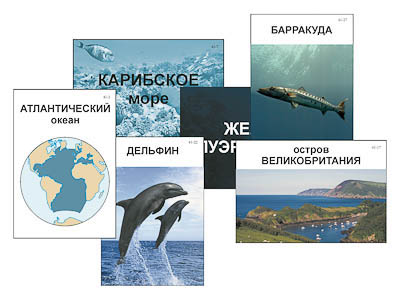 Пособие знакомит учащихся с пятью океанами: Тихим, Атлантическим, Индийским, Северным Ледовитым, Южным. Набор карточек для каждого океана включает следующие изображения: название с контуром океана; одно из морей; глубочайшую впадину; крупнейший остров; типичных млекопитающее и рыбу, обитающих в водах данного океана.