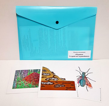 Пособие состоит из 9 цветных карточек модели-аппликации, напечатанных на картоне и ламинированных матовой (антибликовой) пленкой. Карточки располагают на доске последовательно. На карточках 1-3 представлены стадии развития муравья.
