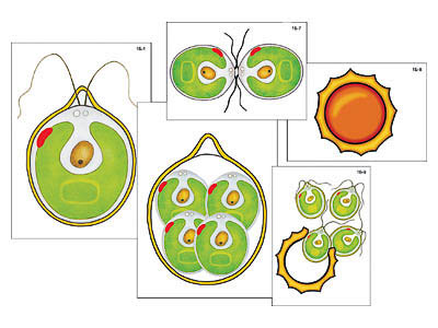 Пособие включает 12 карточек, иллюстрирующих этапы бесполого и полового размножения хламидомонады – одноклеточной зеленой водоросли. Карточки ламинированы матовой (антибликовой) пленкой и снабжены магнитными креплениями, что позволяет монтировать схемы на магнитной доске или экране для динамических пособий.