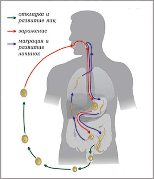 На доске монтируются карточка Х2, на которых изображены контуры тела человека и выделены его внутренние органы: пищевод и желудок. С этих органов начинается заражение человека яйцами аскариды. По ходу объяснения данная карточка заменяется на карточку Х2, на которой выделены легкие и печень, и на карточку Х3, на которой выделен кишечник. Это позволяет продемонстрировать учащимся, в каких именно органах протекает та или иная стадия развития паразита. Рядом с ними монтируются карточки с теми стадиями развития паразита, которые протекают в данных органах.