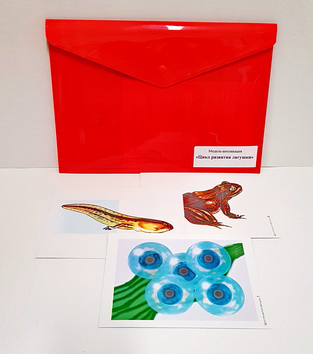 Пособие состоит из 7 цветных карточек модели-аппликации, напечатанных на картоне и ламинированных матовой (антибликовой) пленкой. Карточки, изображающие цикл развития лягушки, располагаются на доске согласно номерам на карточке кругом по часовой стрелке. Пособие снабжено магнитным креплением, что позволяет монтировать схемы на магнитной доске.