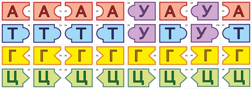 Пособие включает в себя 32 карточки (№ У1-У10). На карточках приведены обозначения азотистых оснований, три из которых: аденин (А), гуанин (Г) и цитозин (Ц) входят как в состав ДНК, так и в состав РНК, тимин (Т) встречается только в молекуле ДНК, а в молекуле РНК его заменяет урацил (У). Каждое азотистое основание приведено в двух вариантах: № У1, У3, У5, У7 предназначены для монтажа одной из цепи ДНК. Карточки № У2, У4, У6, У8 – для монтажа справа от нее второй цепи ДНК, согласно принципу копллементарности. Заменив карточки У8 на У9 можно собрать цепь РНК и продемонстрировать процесс транскрипции. Карточка № У10 предлагается ученикам при выполнении задания, описанного в пятом пункте схемы 1. (Это усложняет задание: если ученик, которому было задано смонтировать вторую цепь ДНК на правой стороне доски использовал данную карточку, учитель указывает ему на ошибку: урацил не может входить в состав молекулы ДНК).