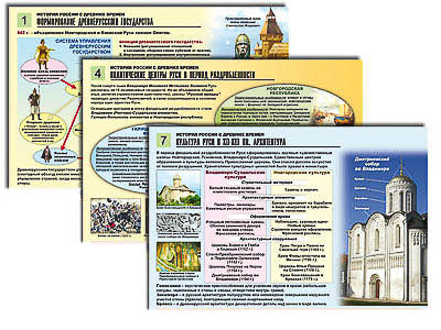 Таблицы: 1. Формирование Древнерусского государства. 2. Принятие христианства на Руси. Христианство и язычество. 3. Культура Киевской Руси. Монументальная живопись. 4. Политические центры Руси в период раздробленности. 5. Политика русских князей в борьбе за независимость от ордынского ига. 6. Борьба с иноземными захватчиками в XIII в. Западная угроза. 7. Культура Руси в XII–XIII вв. Архитектура. 8. Создание централизованного государства. Династия Московских князей. 9. Государственное устройство России при Иване IV Грозном. 10. Культура Руси в XV–XVI вв. Творчество Феофана Грека и Андрея Рублева.