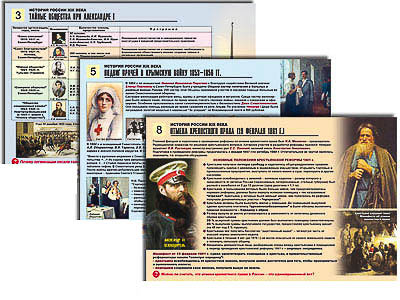 Таблицы: 1. Реформы начала царствования Александра I. 2. Отечественная война 1812 г. Малая война. 3. Тайные общества при Александре I. 4. Собственная Его Императорского Величества Канцелярия. 5. Подвиг врачей в Крымскую войну 1853–1856 гг. 6. Памятники победы России над Наполеоном. 7. Либеральные реформы 60–70 гг. XIX в. 8. Отмена крепостного права (19 февраля 1861 г.). 9. Радикальные общественные движения 1870-х – начала 80-х гг. XIX в. 10. Псевдорусский стиль в архитектуре России конца XIX в.