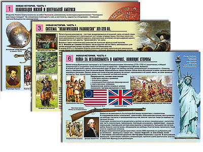 Таблицы: 1. Колонизация Южной и Центральной Америки. 2. Реформация. Религиозные течения. 3. Система "политического равновесия" XVI–XVII вв. 4. Эпоха Возрождения. Леонардо да Винчи. 5. Быт европейца XV–XVIII вв. 6. Война за независимость в Америке. Воюющие стороны.