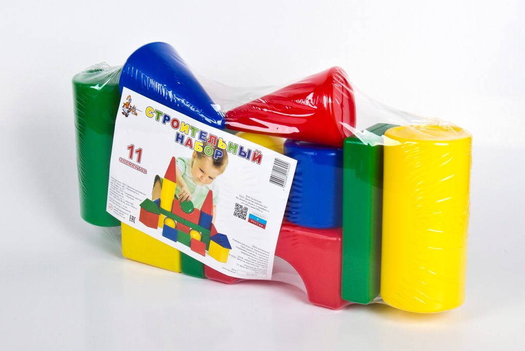 Набор строительный для детей 11 элементов из выдувной пластмассы состоит из: