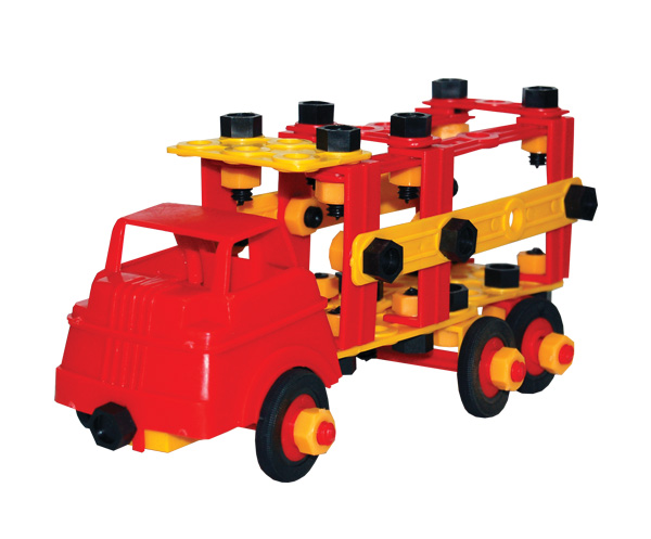 Удобный пластмассовый конструктор с винтами, гайками и отверткой. Детали крупные, винты легко вкручиваются.
