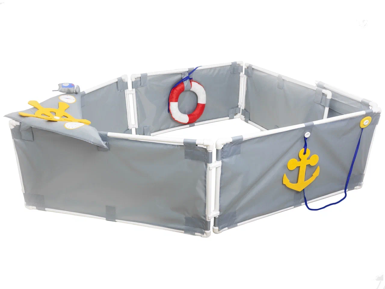 Нос корабля 1 штука - треугольная деталь серого цвета (равнобедренный треугольник, у которого основание 88 см, а две другие стороны 59 см) с наклейками, резинкой для рации и рацией, штурвалом из фетра желтого цвета пристегивающимся на пуговицу