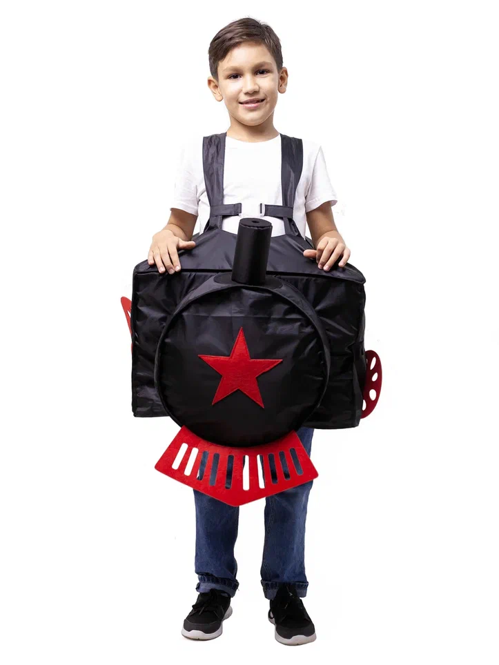 Спереди у паровозика красная звезда, сверху - труба. ПО бокам - карманы. Сзади петля для крепления вагончиков.