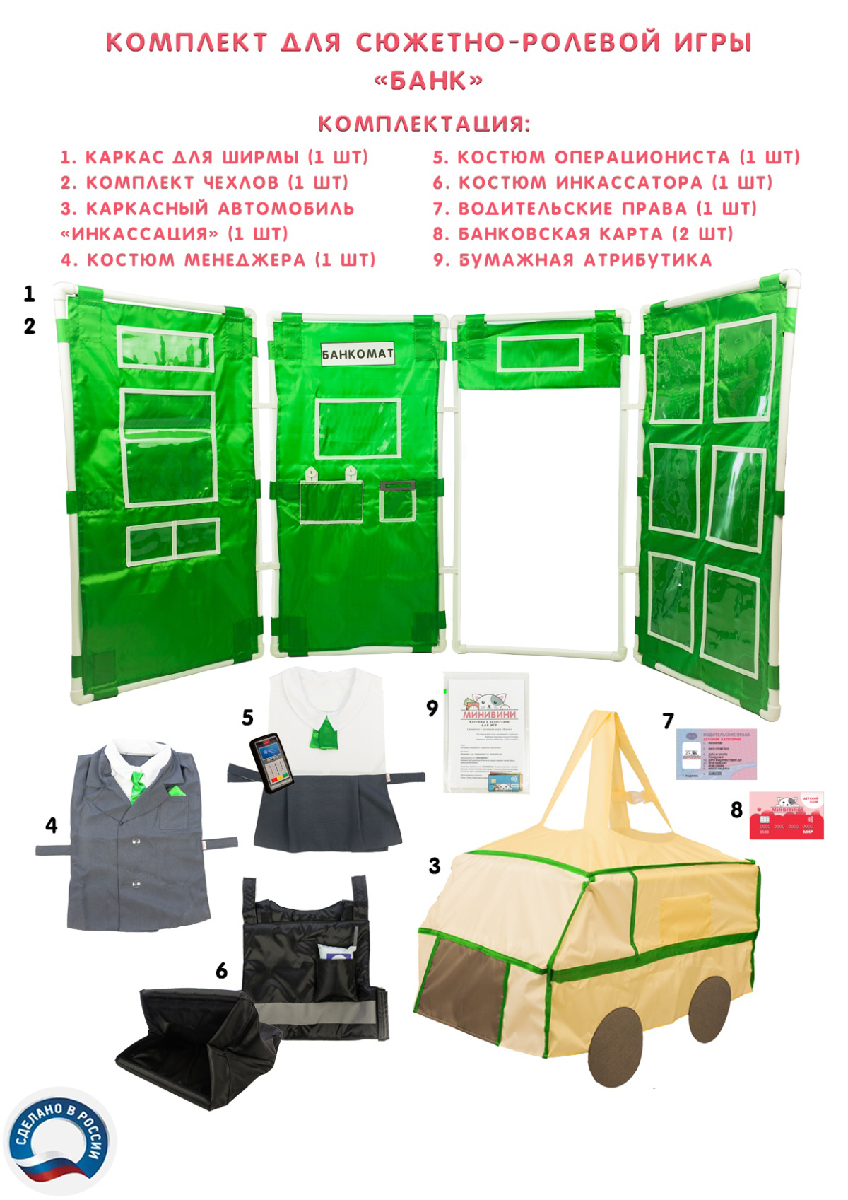 Материал: костюмы, чехлы для ширмы,чехол на каркасный автомобиль – ткань оксфорд (100% полиэстер); каркас для машины, ширма – 100% полипропилен.