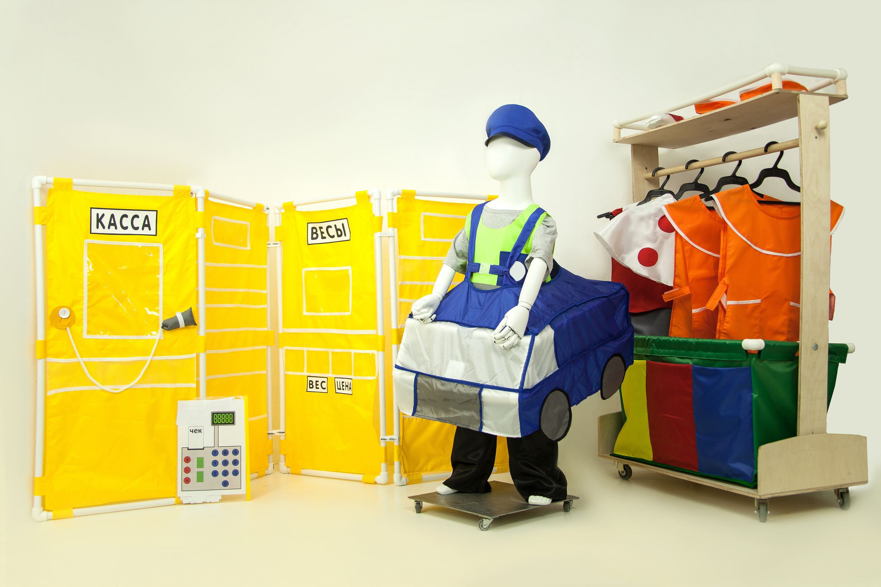 Бумажная атрибутика: кассовые чеки, ценники, счастливчики (прототип денег), картинка кассы, карточки с цифрами (от 1 до 10) два комплекта для весов, картинки овощей и фруктов, карточки – имитация сенсорных весов, права для водителя.